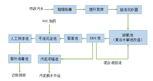 針對以上改造問題,匯恒環(huán)保設計團隊在充分考慮該水廠實際運行情況,以及工藝先進可靠、經(jīng)濟成本合理、充分利用現(xiàn)有設施條件等要素的基礎上,通過加裝機械格柵、增設旋流沉砂器、生化增設EBIS(改良A2O)池、深度處理采用“絮凝池+平流沉淀池+人工快滲池”、加裝紫外消毒設施等解決方法,大大提高系統(tǒng)脫氮除磷性能,并實現(xiàn)系統(tǒng)擴容需求,出水水質(zhì)穩(wěn)定達到一級A標準。