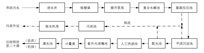 沉淀池的出水進入人工快滲池內(nèi),進一步去除污水中殘留的有機物、總氮等,最終經(jīng)紫外消毒處理后,出水達標排放。