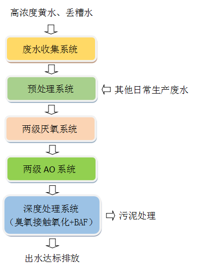 因其他日常生產(chǎn)廢水中污染物濃度較低,因此本方案設(shè)計(jì)將濃度很高的黃水、丟糟水與其他日常廢水按比例“勾兌”,緩慢釋放,既保證了高濃度黃水和丟糟水不對(duì)污水處理系統(tǒng)造成沖擊影響,又能使進(jìn)入污水處理系統(tǒng)的的廢水不產(chǎn)生濃度過(guò)低的現(xiàn)象,提高系統(tǒng)的利用效率。