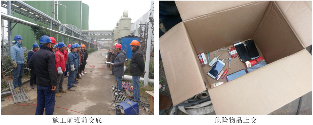 由于管道對接存在動火作業,一期厭氧罐、脫硫區域內管道及設備內部幾乎均有沼氣,危險性較大。正式施工前,召開班前會議,進行方案交底工作,做到“三交一清”(施工任務交底、施工環境交底、安全注意事項交底,清楚員工思想及身體動態)。