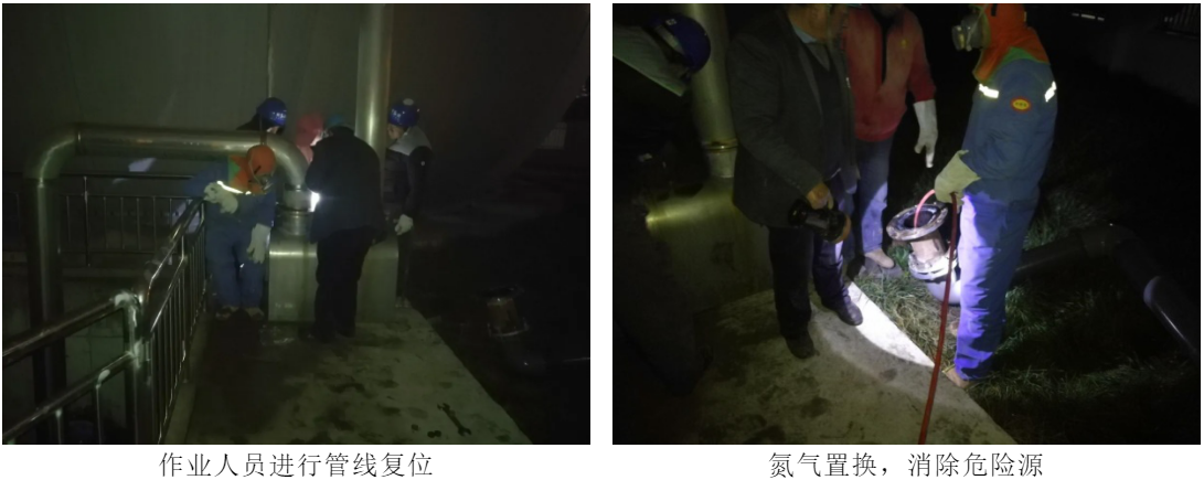 在正式施工前,上交打火機、香煙、手機等,要求工具使用銅制扳手。氣體置換完成后,對動火點再次進行氣體檢測,并嚴格按照安全操作規程,按動火票制度開具作業票,以及配置滅火器、監火人,各項條件具備并檢查確認后進入動火作業。針對施工人員,強調作業期間必須佩戴安全帽、安全帶,對作業時可能存在沼氣泄漏的作業人員還應佩戴防毒面具。